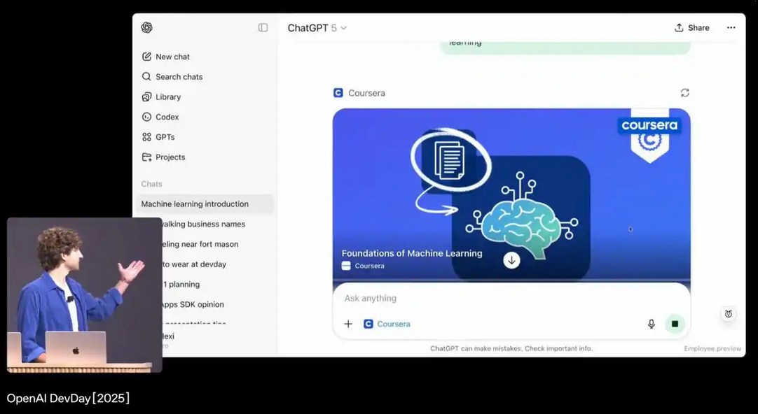 本届 DevDay 上,OpenAI 正式推出 “Apps in ChatGPT” 框架——开发者可以通过 SDK 将自己的服务嵌入到 ChatGPT 中,用户无需离开聊天界面即可触发、交互、购买。